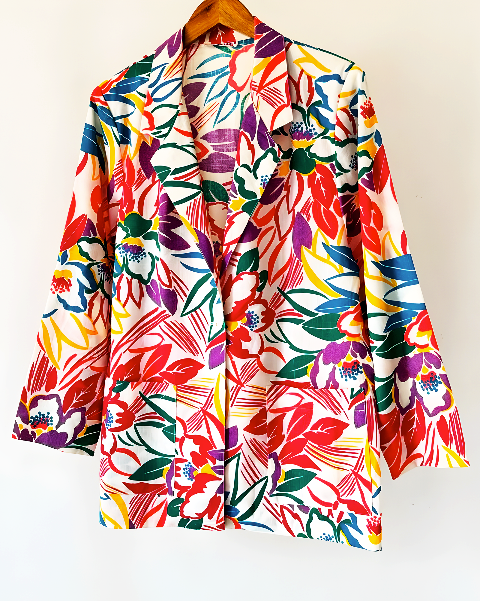 Unapologetically loud and joyfully bold β this oversized blazer bursts with tropical blooms and bright hues of red, purple, yellow, green, and blue. Made with crisp cotton fabric and a breezy fit, itβs the ultimate mood-lifting piece for those who dress to express.