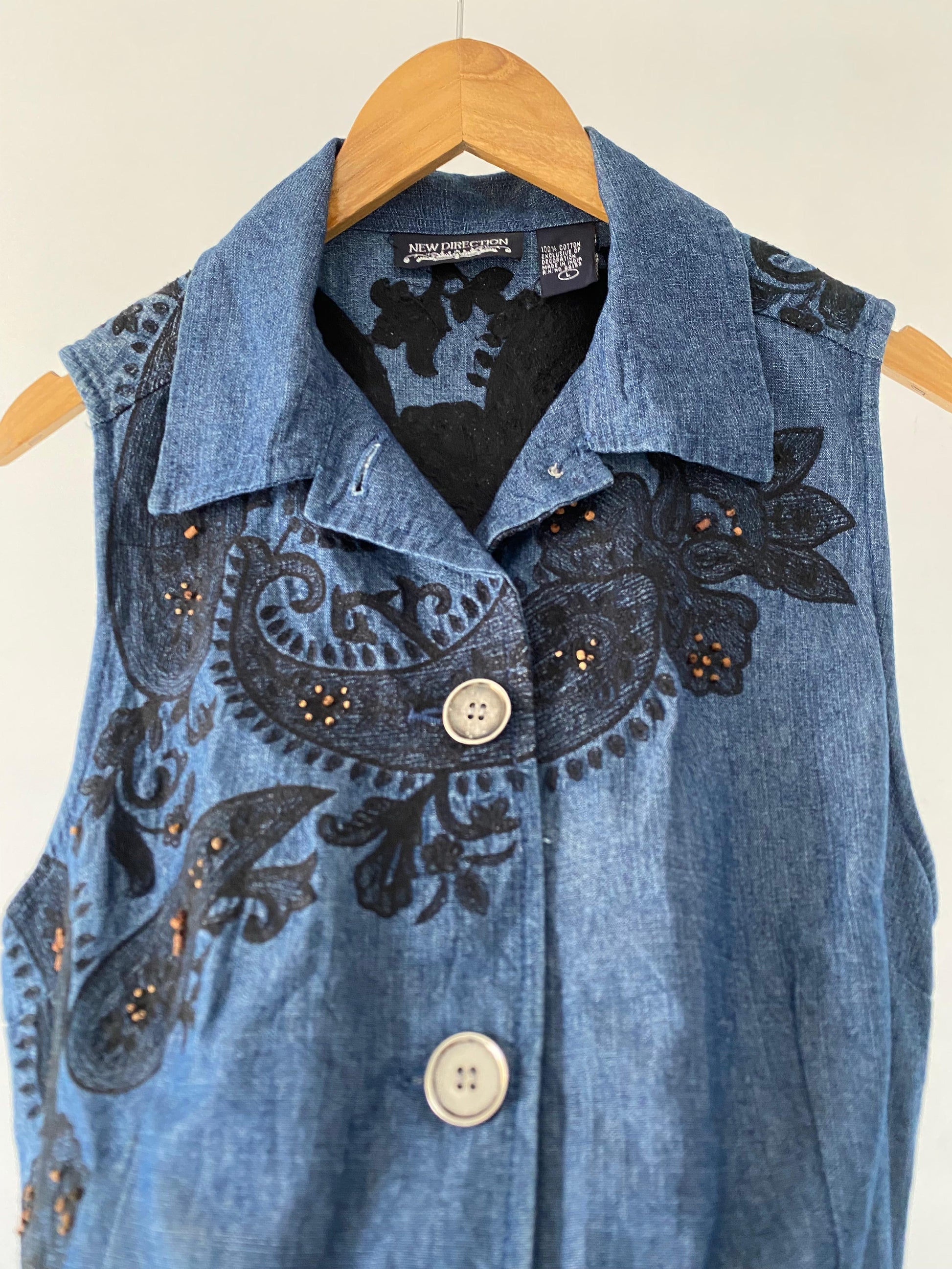 Channel effortless retro energy with this vintage denim vest featuring intricate black velvet paisley embroidery and delicate beaded accents. The structured silhouette and bold detailing make it the perfect layering piece to elevate your basics or add edge to feminine fits.