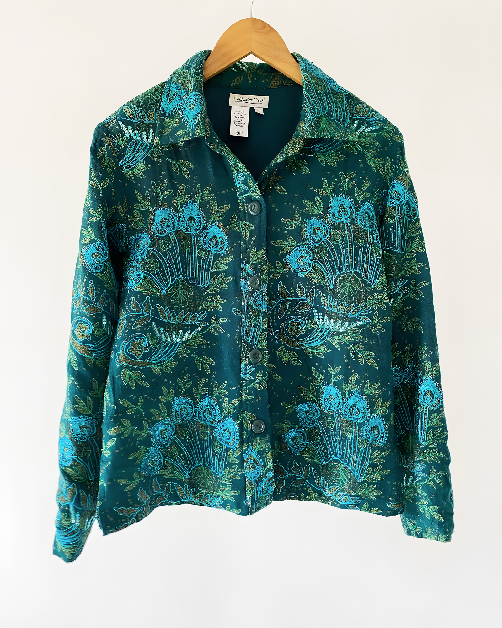 Luxurious and artistic โ this deep emerald green shirt is richly embroidered with swirling teal floral motifs and metallic thread accents. Crafted from plush velvet-like fabric, it drapes beautifully while adding a hint of opulence to any outfit.