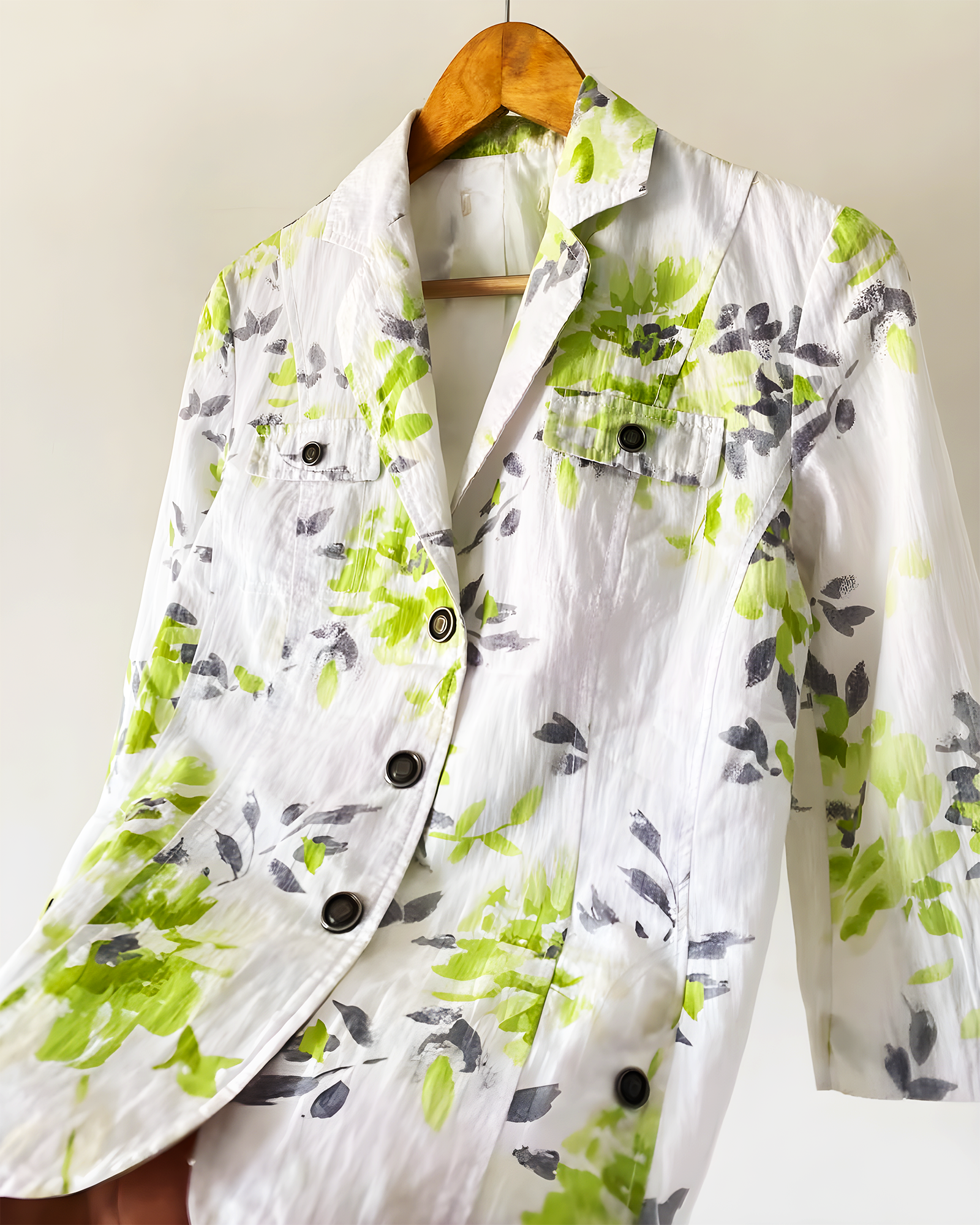 Soft, breezy, and effortlessly fresh ā this lightweight blazer features painterly lime green florals with soft charcoal accents on a crisp white base. Made with a subtle crinkle texture, it adds instant charm to any spring or summer outfit.