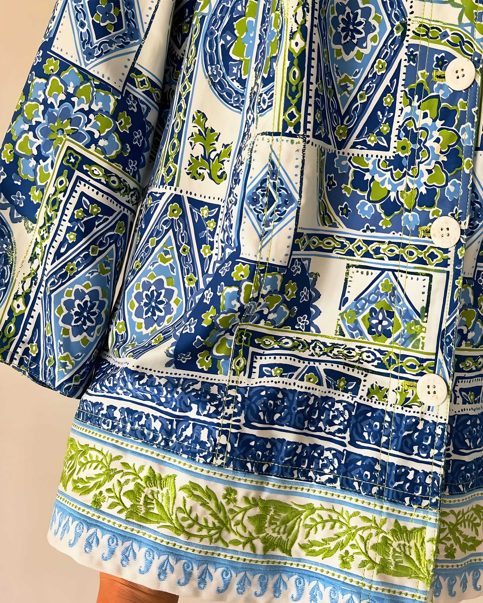Channel summer holidays and sun-kissed strolls in this stunning jacket inspired by Mediterranean tiles. Featuring a mosaic of blue, white, and olive green patterns with a glossy finish and structured collar — this piece is equal parts bold and breezy.