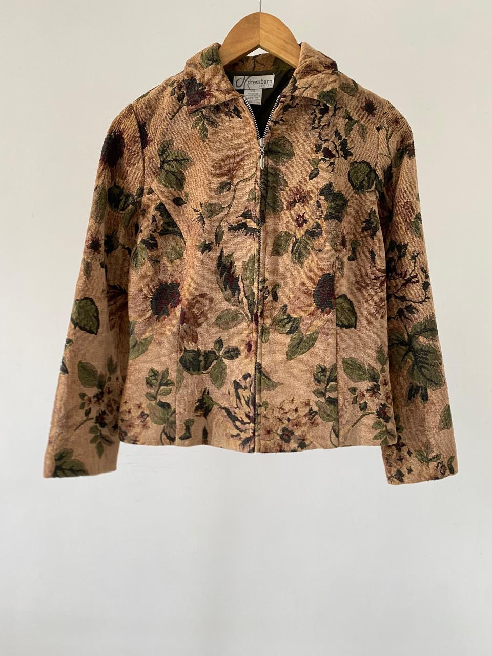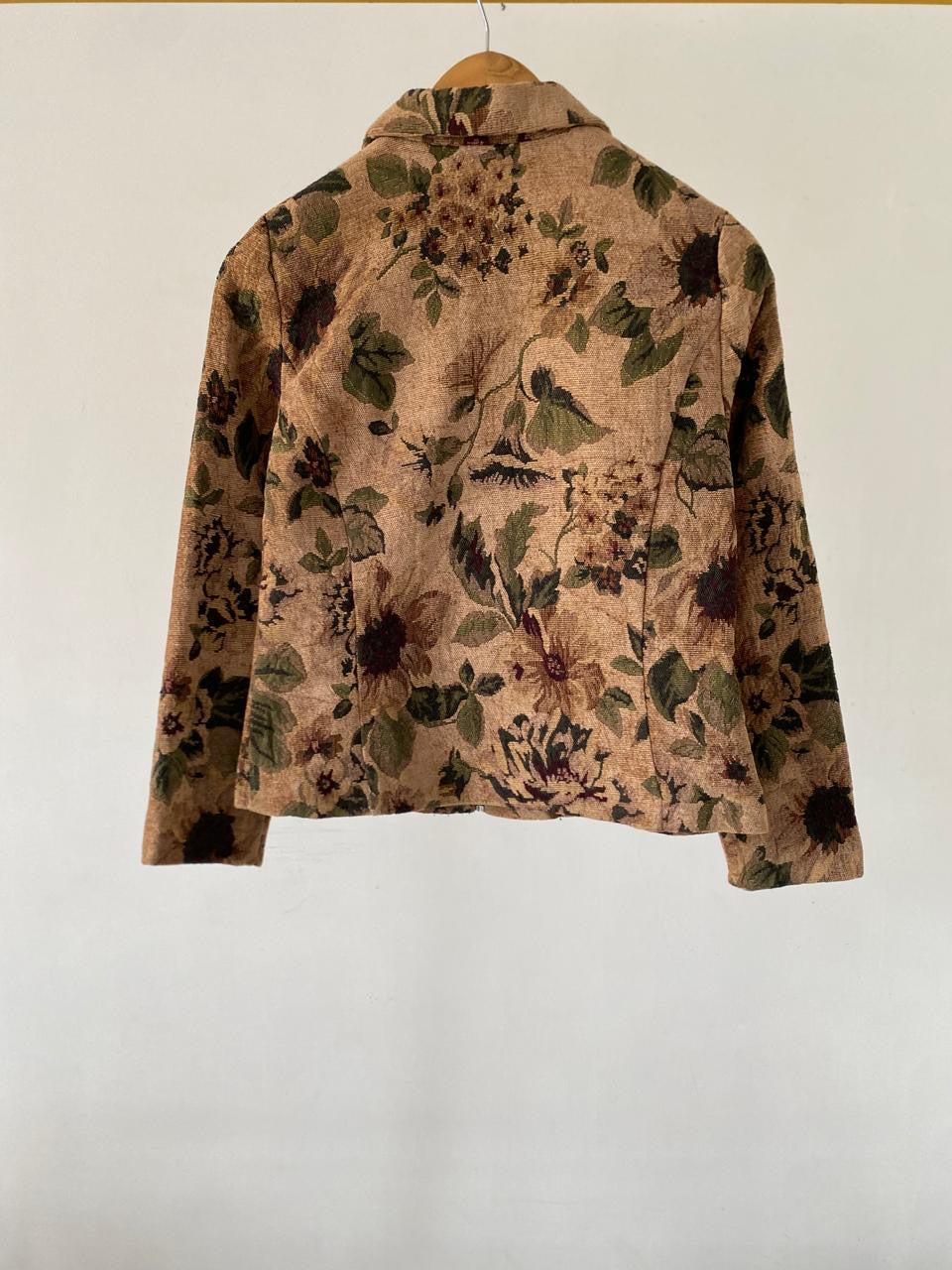 A blooming beauty from the past, this floral tapestry vest brings cottagecore charm with bold woven florals, earthy tones, and vintage softness. Fully lined and made to stand out.
