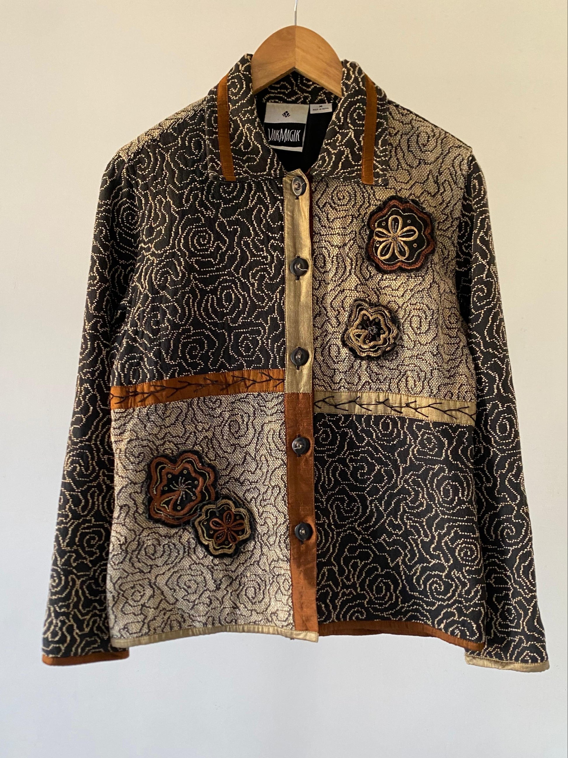 This richly textured jacket blends abstract floral stitching with velvet accents in warm bronze and copper tones. Featuring dimensional flower appliqués and patchwork symmetry, it’s a bold yet grounded piece perfect for artful layering. A touch of boho, a bit of vintage, and all charm.