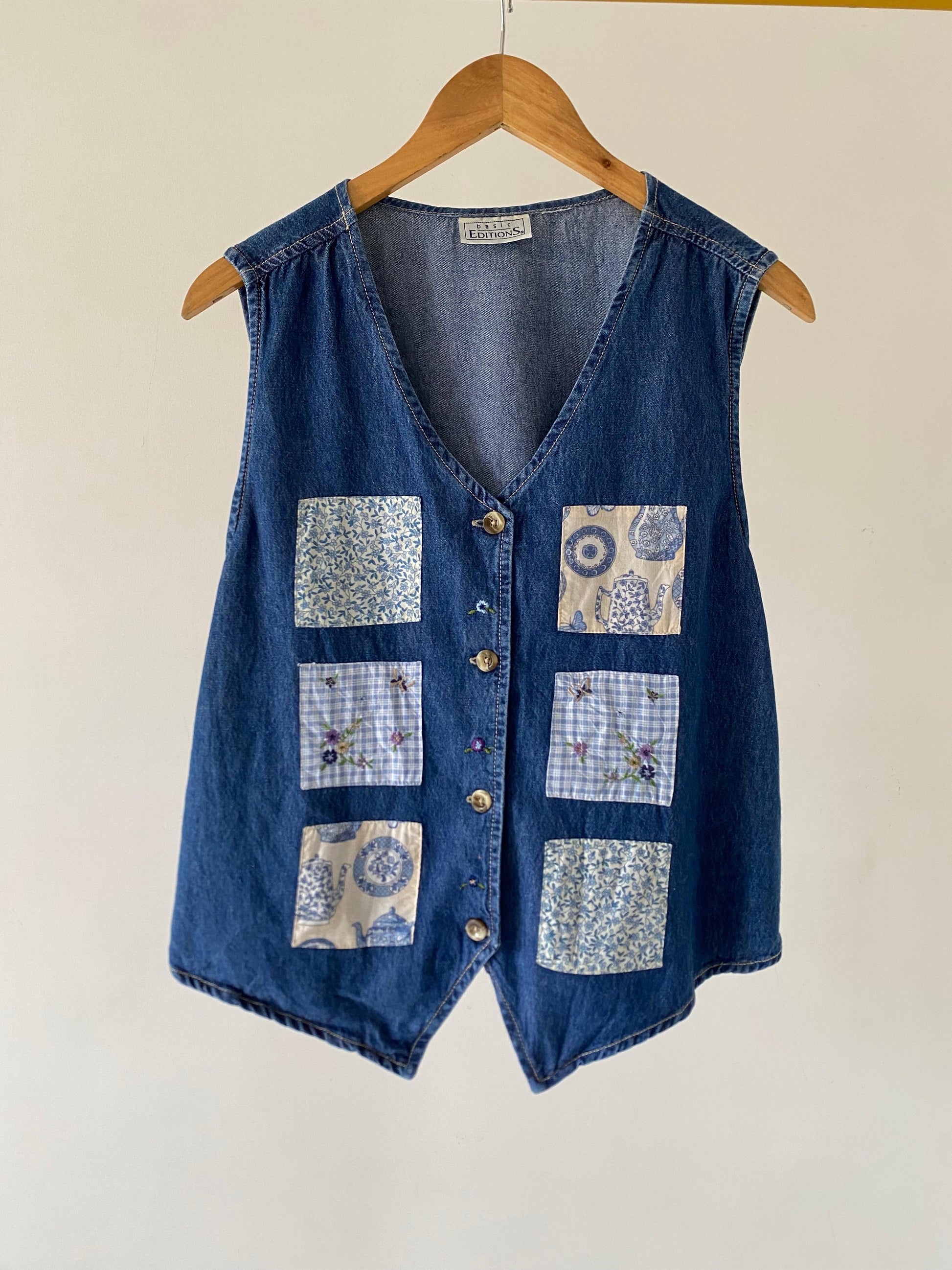 Cozy cottagecore in vest form. This soft denim vest is stitched with delicate patchworks of gingham florals, porcelain teapots, and ditsy prints — like a quilted memory of garden picnics and grandma’s china cabinet.
